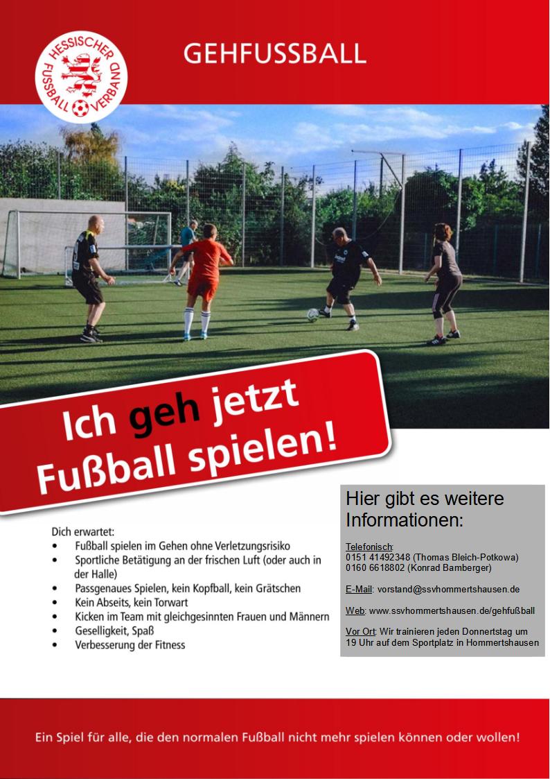 Die Gehfußball Abteilung des SSV Hommertshausen wurde im Juni 2022 eröffnet. Seit Herbst 2023 ruhen die Aktivitäten allerdings wieder, da die Teilnehmerzahlen zu gering waren. Wir verfolgen das Thema aber weiterhin und bemühen uns um eine größere Truppe. Das Angebot richtet sich an Frauen wie Männer, an alt wie jung. Haben wir dein Interesse geweckt? Dann kontaktiere den Vorstand (Kontakt).